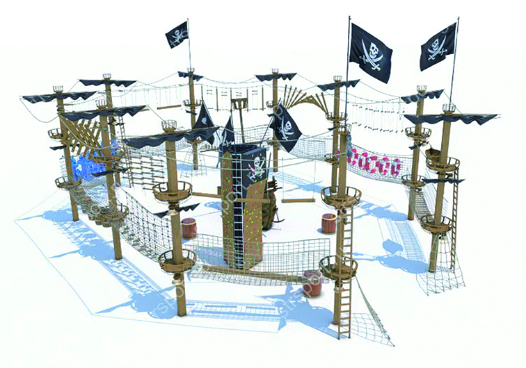 這是一款沉浸式海盜主題室外拓展游樂(lè)設(shè)備,以經(jīng)典海盜船為設(shè)計(jì)靈感,融合了木質(zhì)桅桿、網(wǎng)陣攀爬、攀巖挑戰(zhàn)與骷髏旗等標(biāo)志性元素,打造出充滿冒險(xiǎn)氛圍的海盜世界。主體采用環(huán)保防腐實(shí)木搭建桅桿與平臺(tái),搭配高強(qiáng)度尼龍網(wǎng)陣與玻璃鋼攀巖墻,既還原了海盜船的復(fù)古質(zhì)感,又保障了結(jié)構(gòu)穩(wěn)固與游玩安全。設(shè)備集攀爬穿越、平衡挑戰(zhàn)、親子互動(dòng)于一體,適用于主題樂(lè)園、親子景區(qū)、研學(xué)基地等場(chǎng)景,讓孩子們?cè)诔两降暮1I探險(xiǎn)中鍛煉體能、勇氣與團(tuán)隊(duì)協(xié)作能力,開(kāi)啟一段充滿驚喜的航海冒險(xiǎn)之旅。
