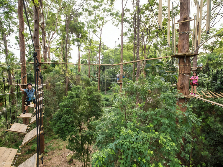 這是一款沉浸式森林主題室外拓展游樂設(shè)備,以天然林木為支撐,構(gòu)建出多層錯落的木質(zhì)棧道與鋼索挑戰(zhàn)關(guān)卡,讓挑戰(zhàn)者在茂密雨林的高空穿梭。主體采用防腐實木打造平臺與棧道,搭配高強(qiáng)度鋼索與金屬連接件固定,既保障了結(jié)構(gòu)穩(wěn)固與游玩安全,又最大程度保留了雨林的原生風(fēng)貌。設(shè)備集高空行走、平衡挑戰(zhàn)、飛索穿越于一體,適用于熱帶雨林景區(qū)、戶外營地、研學(xué)基地等場景,讓挑戰(zhàn)者在與自然的親密接觸中鍛煉平衡感、勇氣與探索精神,沉浸式感受雨林探險的刺激與壯闊。