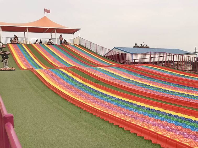 這是一款以彩虹色為視覺核心的無動力旱雪滑道,采用紅、橙、黃、綠、藍、紫等明快色彩拼接成多條并行滑道,搭配緩坡地形與防滑毯面,營造出充滿活力的游樂氛圍。