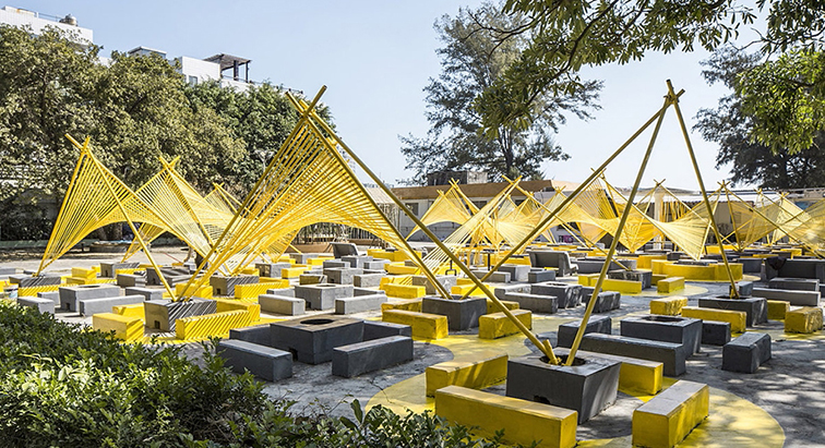 這是一款兼具休憩與互動功能的公共藝術(shù)景觀裝置,以黃色張拉膜結(jié)構(gòu)為視覺核心,搭配黃灰撞色的幾何模塊化座椅,整體造型如散落于戶外的金芒織陣,視覺上充滿現(xiàn)代藝術(shù)感與活力。