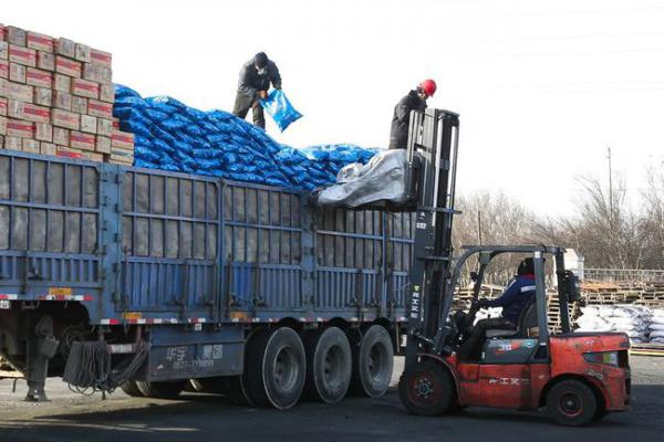 哈密市藍色火宴新能源開發(fā)有限責(zé)任公司工人在裝載銷售產(chǎn)品。( 記者 邢寶玉)