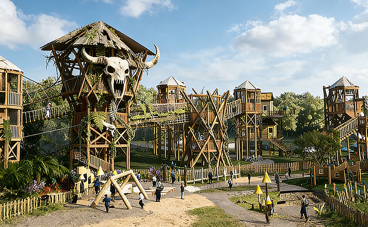 這是一款沉浸式原始部落風(fēng)室外拓展游樂設(shè)備,以巨型牛頭圖騰樹屋為核心,打造出多層錯(cuò)落的木質(zhì)樹屋群與高空棧道,搭配茅草屋頂與仿真綠植,營造出神秘的蠻荒部落氛圍。主體采用環(huán)保防腐實(shí)木搭建樹屋與棧道,搭配玻璃鋼圖騰雕塑與鋼索系統(tǒng),既還原了部落的質(zhì)樸野性,又保障了結(jié)構(gòu)穩(wěn)固與游玩安全。設(shè)備集高空行走、樹屋探索、親子互動(dòng)于一體,適用于主題樂園、自然景區(qū)、研學(xué)基地等場景,讓孩子們在沉浸式的部落探險(xiǎn)中,鍛煉體能、勇氣與團(tuán)隊(duì)協(xié)作能力,開啟一段充滿原始魅力的探險(xiǎn)之旅。